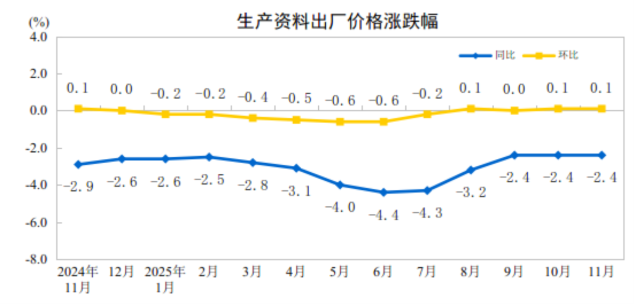 2025年11月份,全国工业生产者出厂价格同比下降2.2%,工业生产者进价同比下降2.5%;工业生产者出厂价格和进价环比均上涨0.1%,涨幅均与上月相同。1—11月平均,工业生产者出厂价格比上年同期下降2.7%,工业生产者购进价格下降3.1%。